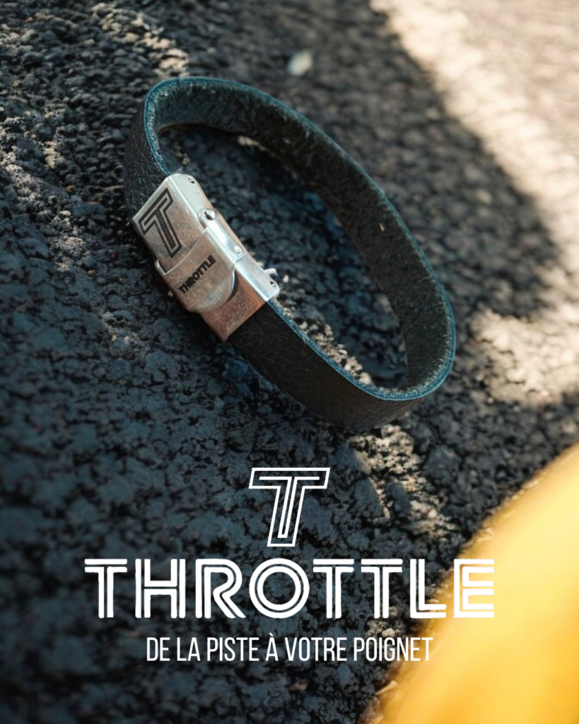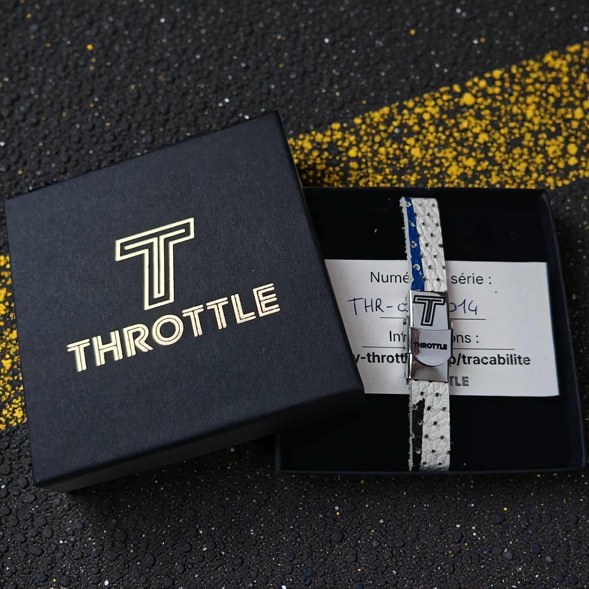 Chaque bracelet est découpé, assemblé et finalisé à la main, en série limitée, à partir d’une seule combinaison. Tous les bracelets Throttle possèdent un numéro de série individuel : il permet de retrouver l’origine du cuir, l’historique de la combinaison et la zone dont provient la matière.